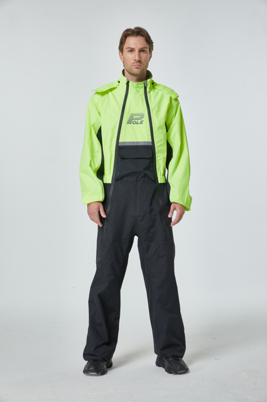 • One-piece raincoat. Taslan coated PU fabric.Taped seams sealed. Hood stowed inside the collar or can be detached. Placket adopts two waterproof zippers. Back with reflective printing strip. Front with three-dimensional patch pocket. Both sides of the Zippers in the. sleeves with reflective taps. Adjustable Sleeve, Cuff, Ankles ( Sleeves with waterproof zipper,Cuffs, feethole with elastic adjustment). Whole crotch block. Large capacity packaging bag, can be carried on the back or shoulder. Special backpack storage bag is available stored under the seat or inside the top case.
