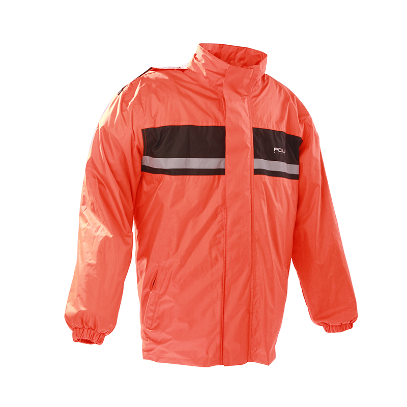 Hood stowed in collar.Cuff and ankle with velcro adjustment. Two frontal zipper pockets on jacket. Reflective tape on front and back.With a bag can put under the saddle.