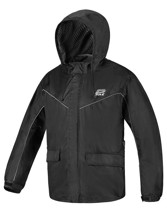 Hood stowed in collar. Reflective tape in front and back of jacket. Waist and sleeves cuff with velcro adjustment. Pants cuff with triangle extension part and velcro closure. Two waterproof pockets in jacket. With a bag can put under the saddle.
