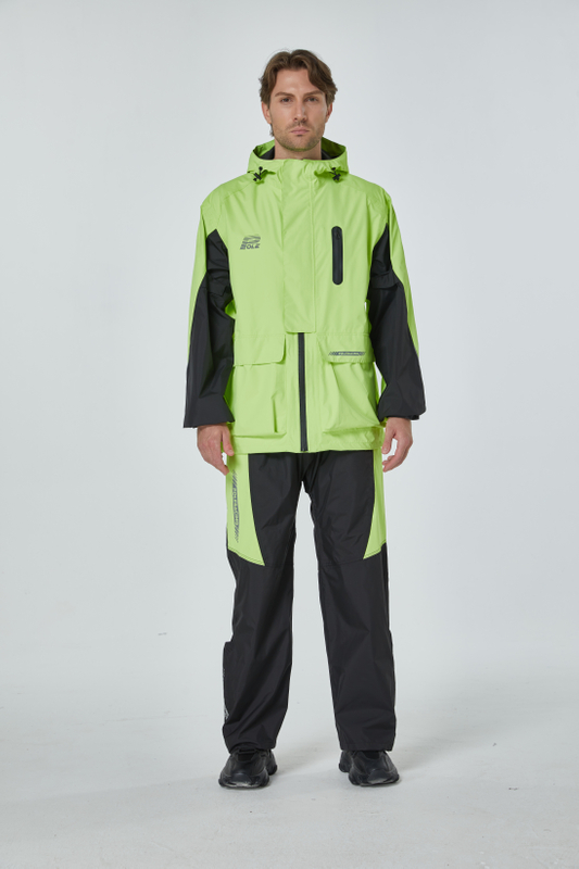 Soft and light waterproof fabric with antistatic and antibacterial functions.Taped seams sealed.Hood stowed inside the collar.Fashion overlapping closure with waterproof zipper.Reflective strips on the back sleeves.Back with air vents.Front multi-pockets.The crotch block design.Adjustable bottom and ankle.( Bottom with ropes. Ankle with Velcro).Storage bag is available stored under the seat or inside the top case.